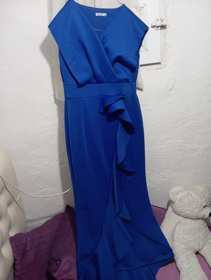 Drapeli detaylı, v-yaka, kolsuz ve uzun lacivert elbise, modern ve minimalist tarzda düğünler için uygun.