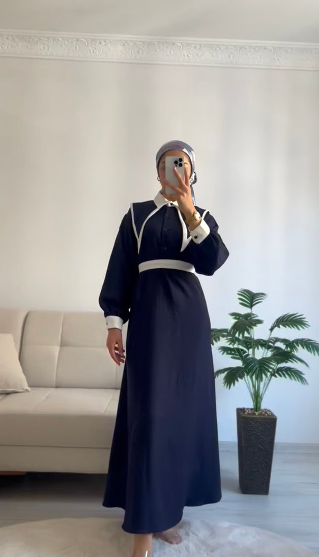 Uzun Lacivert , etnik desenli, yüksek yakalı, uzun kollu ve kemerli elbise. Sentetik kumaştan, koyu renkte ve modest kesimde.