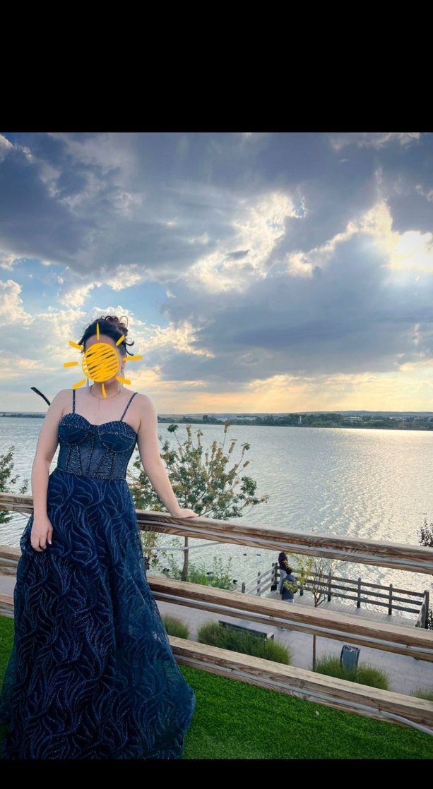 Lacivert, uzun, gotik tarzda, drapeli ve bağlama desenli, fit kesim abiye elbise. 1 gün 4 saat giyildi etek ucunda hafif bir kirlilik var