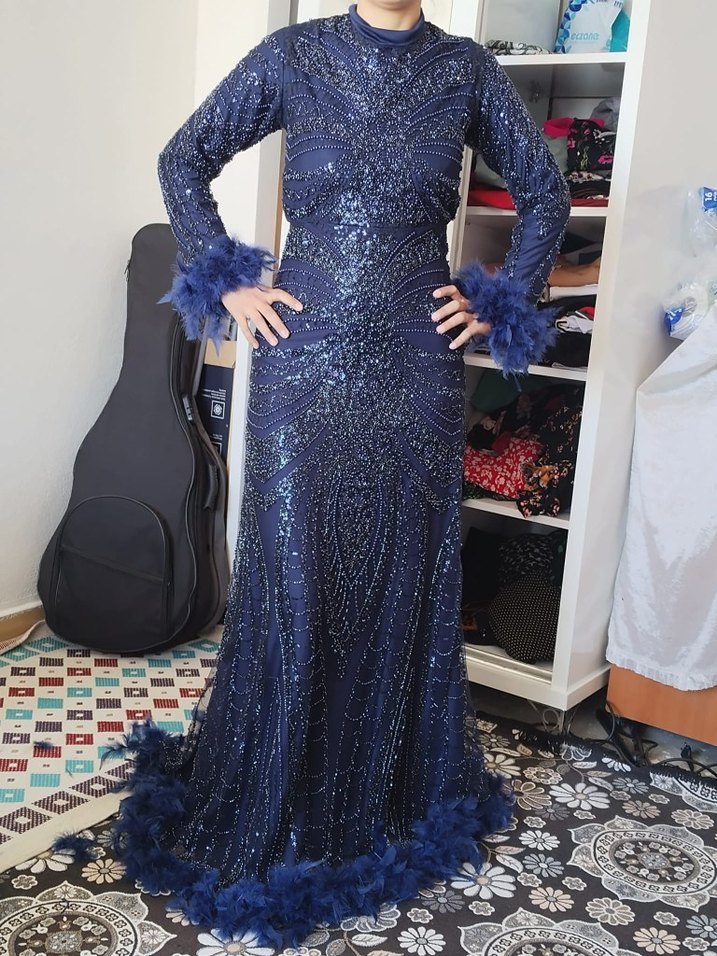 Yüksek yakalı ve uzun kollu, drapeli ve desenli gotik tasarımlı, oturan uzun lacivert abiye elbise, düğünler için uygun. kendim diktim hiç giyilmedi L bedene de uygundur