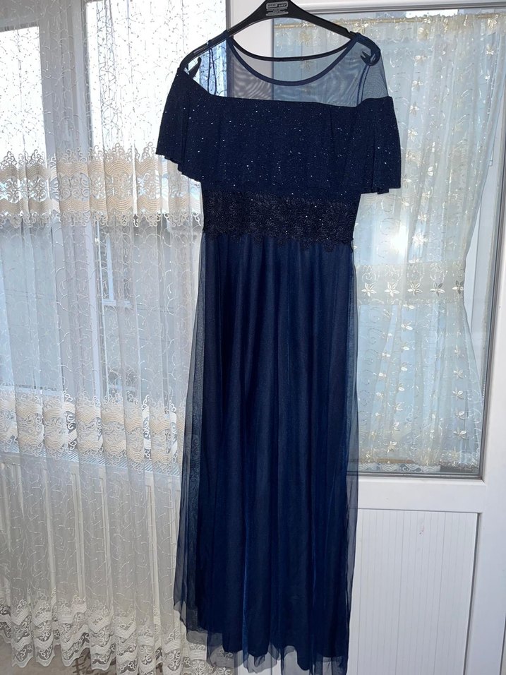 Bu uzun lacivert elbise, straplez yaka, kısa fırfırlı kollara ve desenli detaylara sahip, gotik tarz düğünler için uygun.