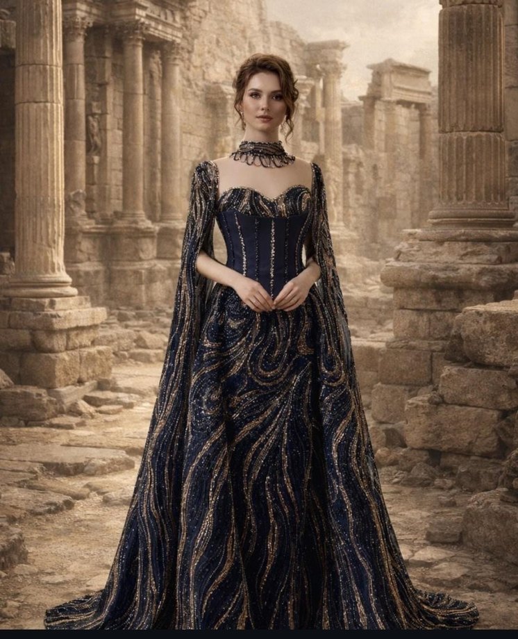 Lacivert, uzun, straplez ve işlemeli kumaşla drapelenmiş, klasik gotik şıklığı yansıtan fitted abiye elbise. Kolsuz tasarımıyla zarif duruş sağlar.