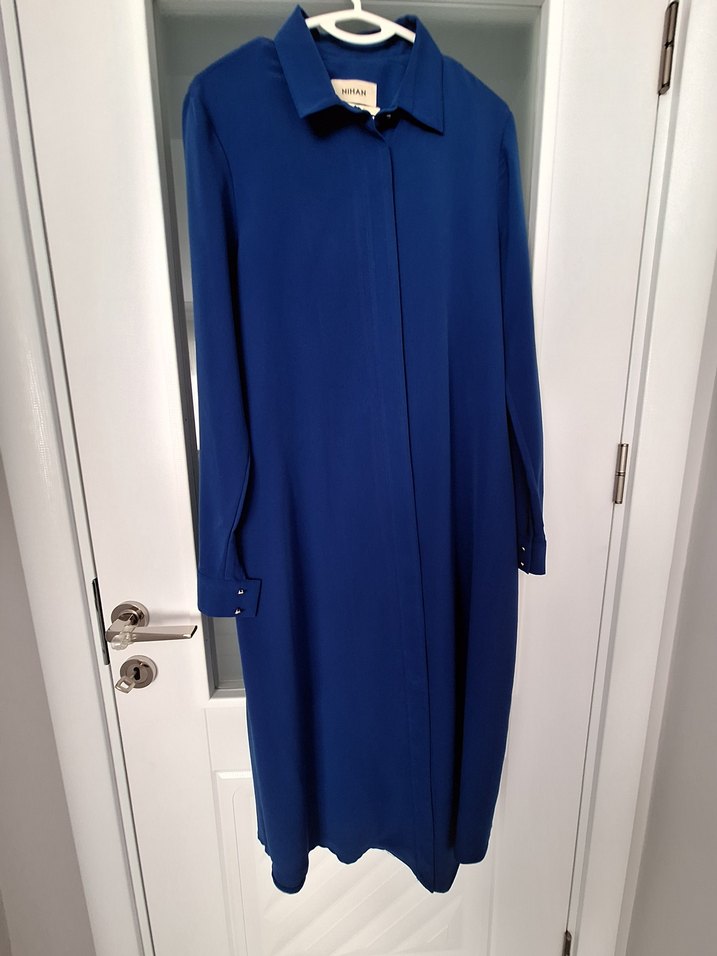 Uzun lacivert tunik gömlek, ipeksi kumaş ve drapeli tasarıma sahip. Notlu yaka ve uzun kollu, ofis için klasik şıklık sunar.
