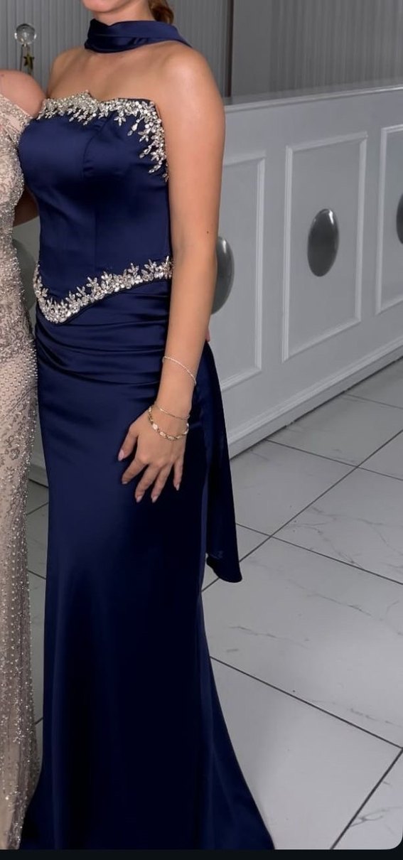 Uzun, straplez, dar kesim lacivert abiye elbise. Parlak kumaş ve zarif işlemelerle süslenmiş, düğün için uygun. Kolsuz ve modern klasik tarzda.