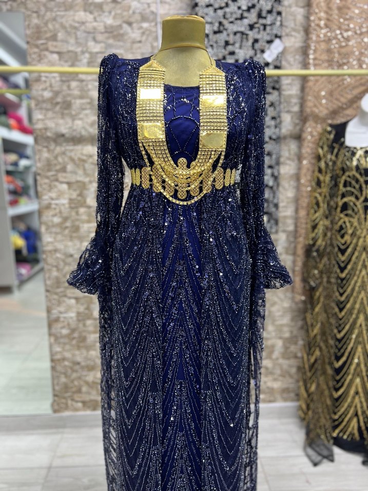 Uzun lacivert işlemeli ve boncuk detaylı abiye elbise, kayık yaka ve ince askılı kollara sahip, düğünler için uygun. ✨