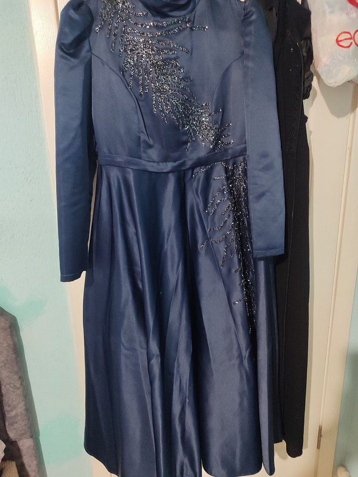 Uzun, vücuda oturan lacivert abiye, parlak işlemeli desenler ve drapeli tasarıma sahiptir. Notlu yaka ve uzun kolludur, düğünler için uygundur.koltuk altlarin bir santim ek parca konulmusdur isterseniz cikardabilirsiniz