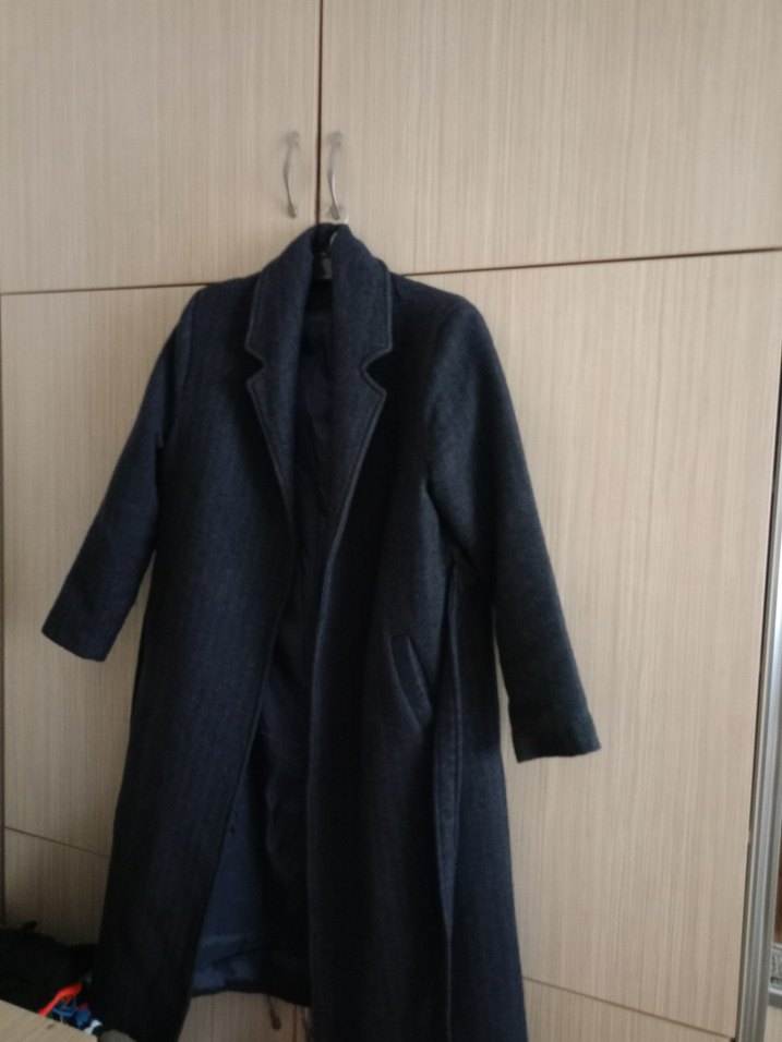 Uzun lacivert kaban, klasik yaka ve düz kesime sahip. Soğuk havalar için yumuşak ve sıcak kumaştan üretilmiştir. Yan ceplidir ve sade bir tasarımı vardır.