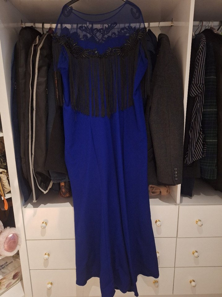 Uzun lacivert abiye elbise, keskin yaka ve ince askılı kollara sahiptir. Dökümlü tasarımı ve rahat kesimiyle avant-garde tarzını yansıtır. Parti için uygundur.