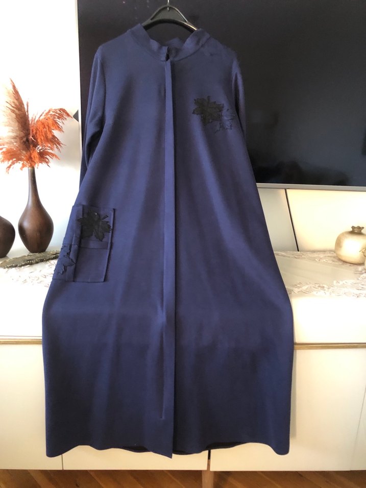 Uzun boy, lacivert renkli kadın bornozu, regular kesim ve uzun kolludur. Minimalist ve normcore tarzda, desensiz ve koyu renklidir.