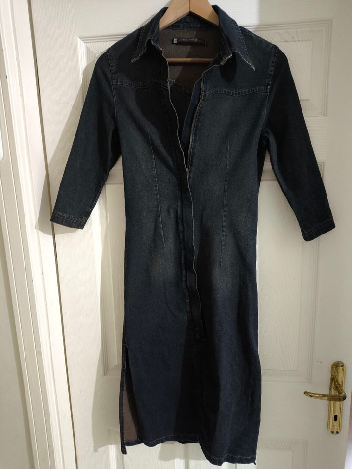 Fitted kesim, uzun kollu, düğmeli, lacivert uzun kadın denim ceket elbise, notched lapel yaka ile günlük kullanıma uygun.
