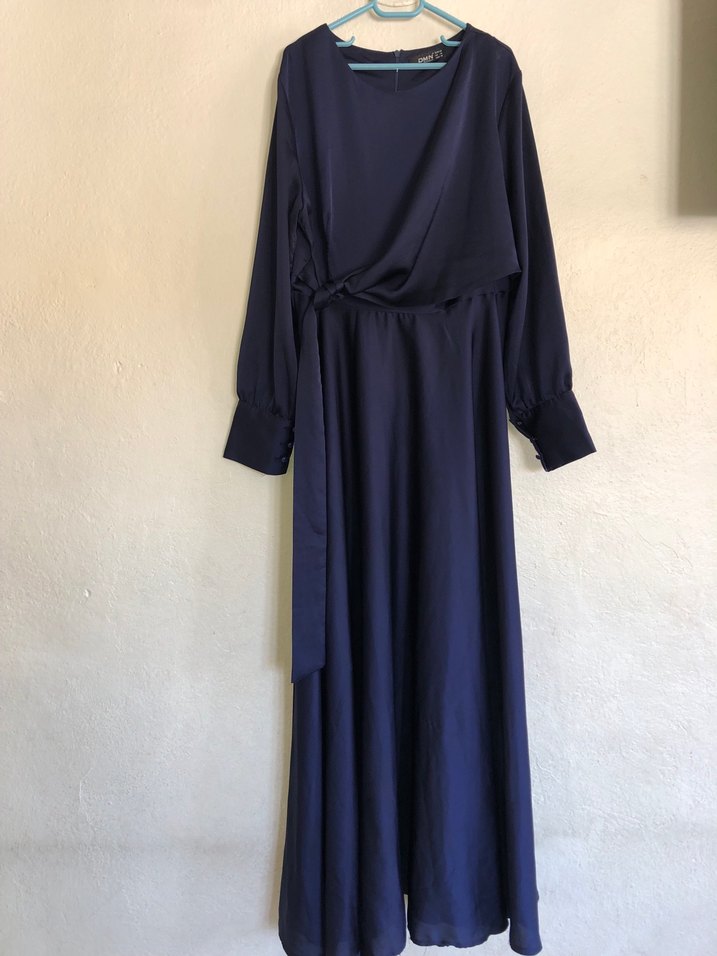 Uzun lacivert elbise, dökümlü ve bol kesim, yumuşak ve parlak kumaş ile. Uzun kollu ve yüksek yakalı, modern klasik ve sade tarz için uygundur.