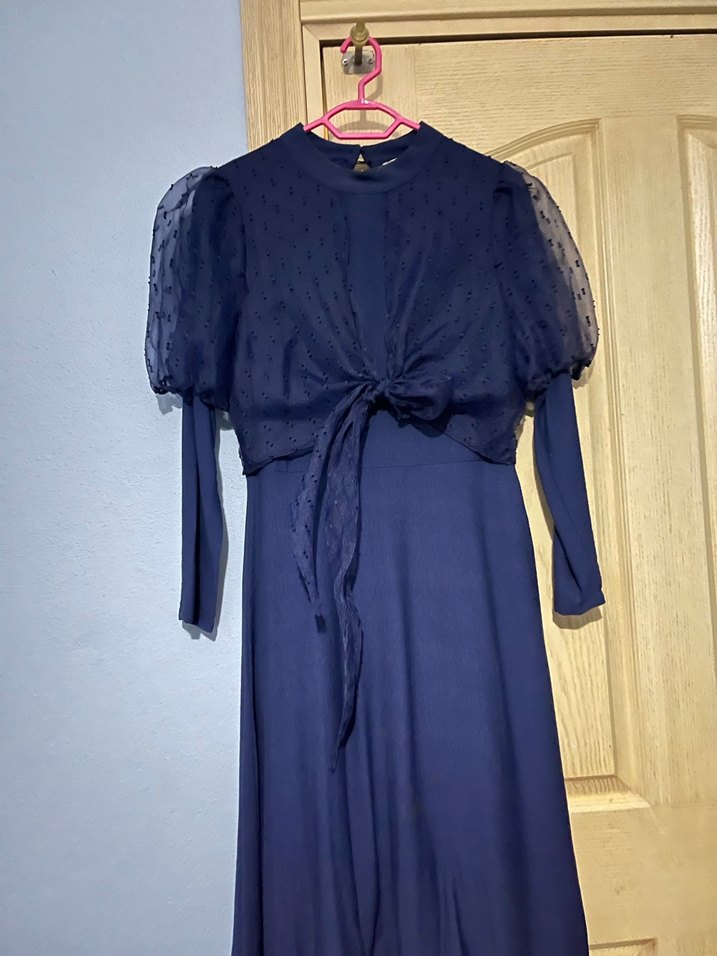 Yüksek yakalı, drapeli, uzun kollu, lacivert sentetik kumaştan yapılmış, klasik modern tarzda, düğün için uygun, vücuda oturan uzun kadın elbisesi.