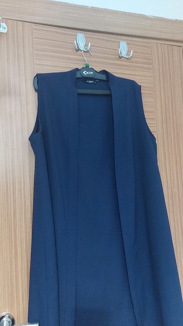 Kolsuz, uzun lacivert yelek, çentikli yaka ve drapeli tasarıma sahiptir. Parlak sentetik kumaştan, ofis için uygun, rahat kesimlidir. Minimalist ve normcore tarzda.