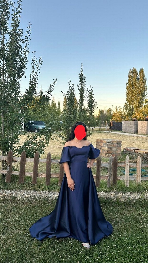 Bu uzun lacivert abiye elbise, drapeli tasarımı, kayık yaka ve kısa kollara sahiptir. Düzenli kesimiyle klasik zarafet ve gotik stili bir araya getirir, düğünler için uygundur.