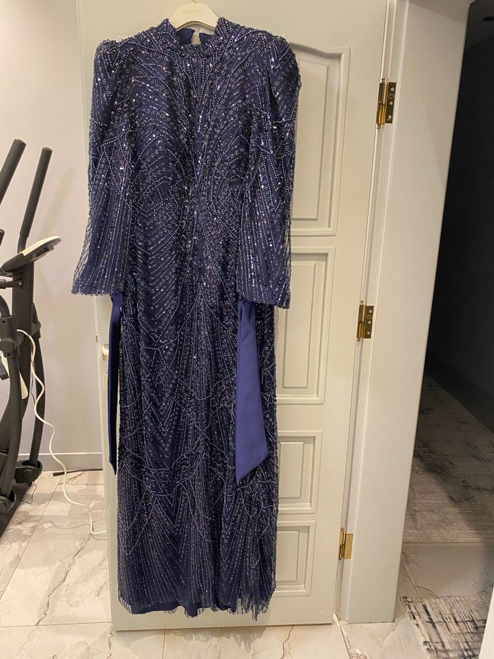 Uzun Lacivert Nakışlı Kadın Abiye Elbise