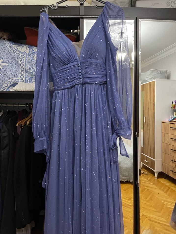 Uzun lacivert parıltılı abiye elbise, V yaka ve uzun kollu, bohem tarzda, bol kesim ve drapeli detaylara sahip. Düğünler için uygun.✨ Hiçbir sorunu yoktur, 1-2 kez giyildi 40-42 bedene de olur.