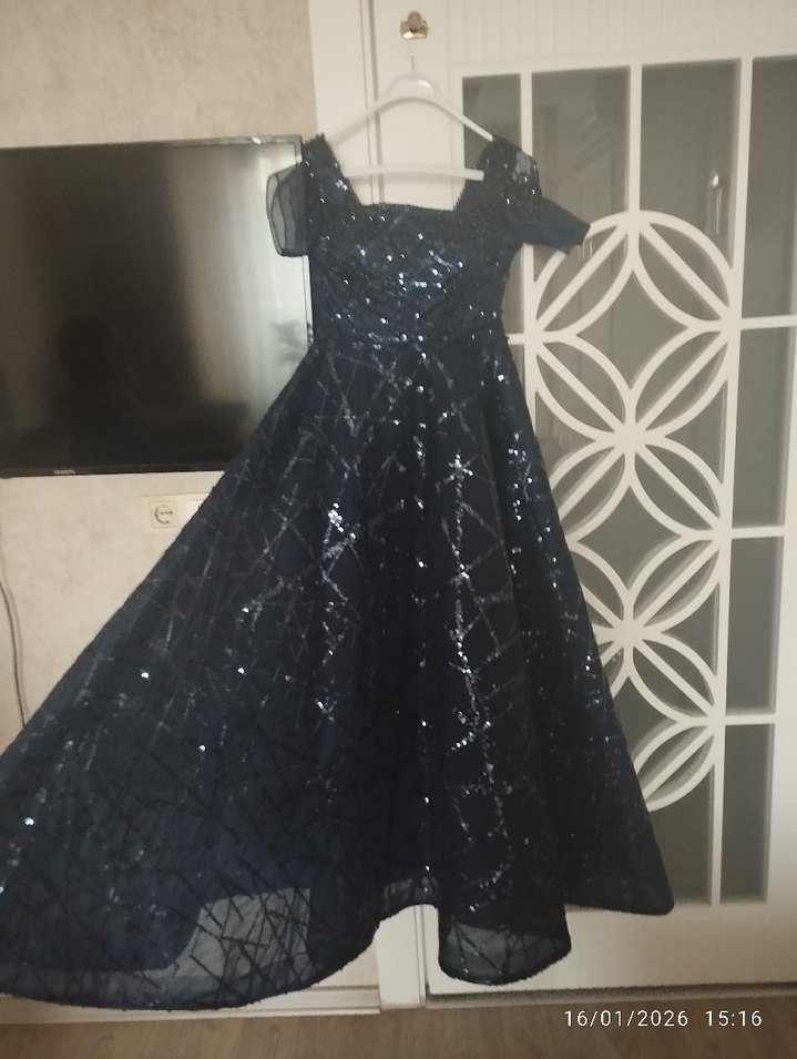 Uzun ve dar kesim lacivert abiye, tekne yaka ve askılı kollarıyla parıltılı işlemelere sahip, gotik düğünler için uygun. ✨