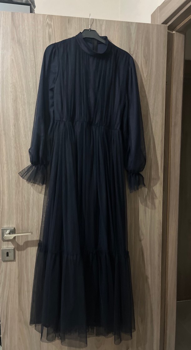 Uzun lacivert piliseli elbise, yüksek yakalı ve uzun kolludur. Kolları narin fırfırlarla son bulur. Gevşek kesimli, klasik gotik tarzda, düğün için uygundur. Yumuşak sentetik kumaştan yapılmıştır. Şal ve kemerde dahildir