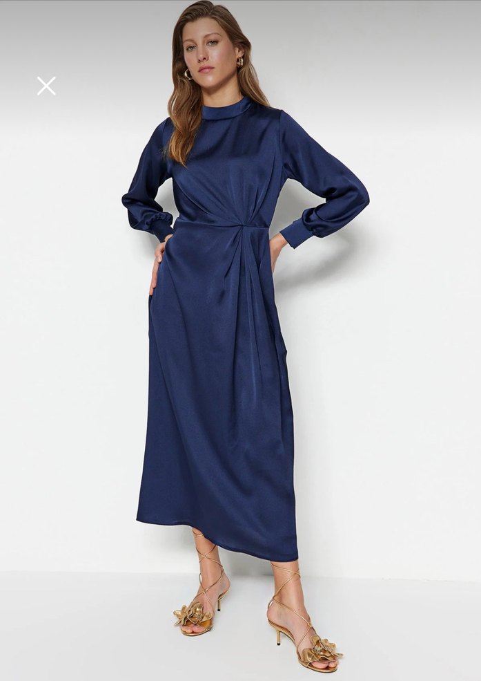 Yüksek yakalı, uzun kollu, saten kumaştan yapılmış, drapeli detaylı uzun lacivert elbise. Romantik akşamlar için ideal şık tasarım.