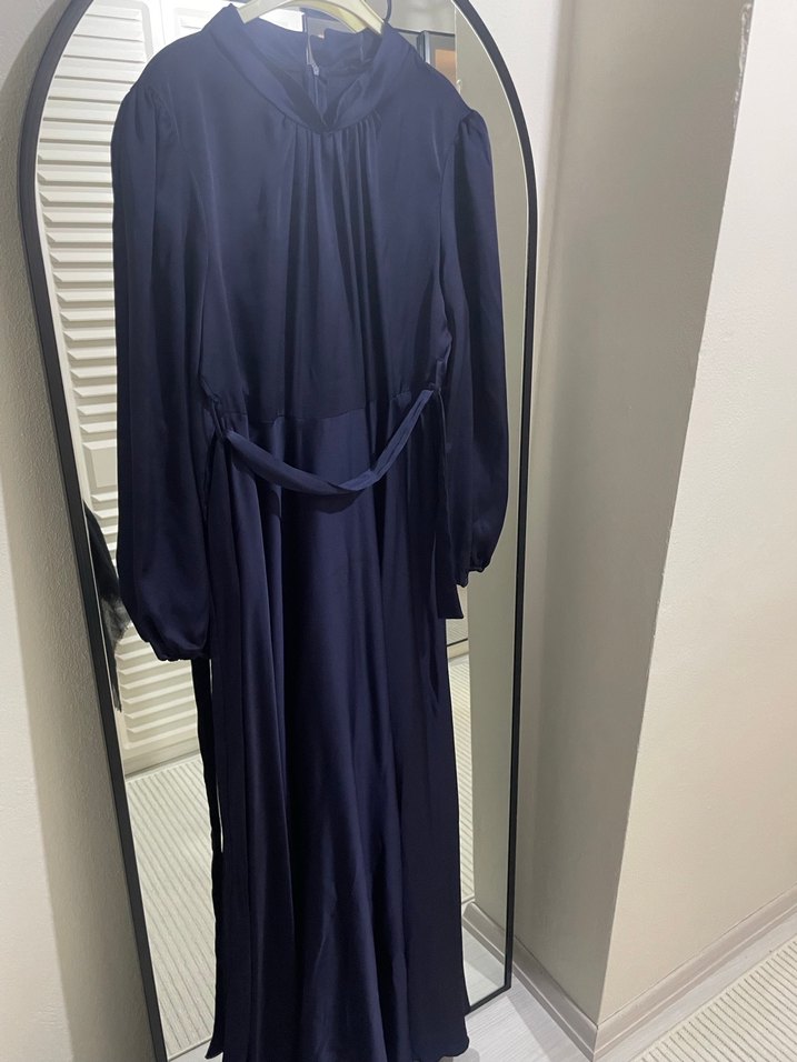 Uzun lacivert saten elbise, yüksek yakalı ve drapeli tasarıma sahiptir. Salaş kesimi şıklığıyla davetlere uygun, sade ve zarif bir elbise