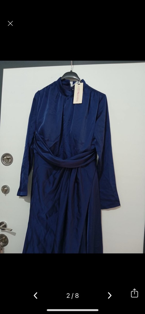 Yüksek yakalı, uzun kollu ve drapeli detaylı, saten lacivert uzun kadın elbisesi. Düzenli kesim, minimalist ve sade tarzda