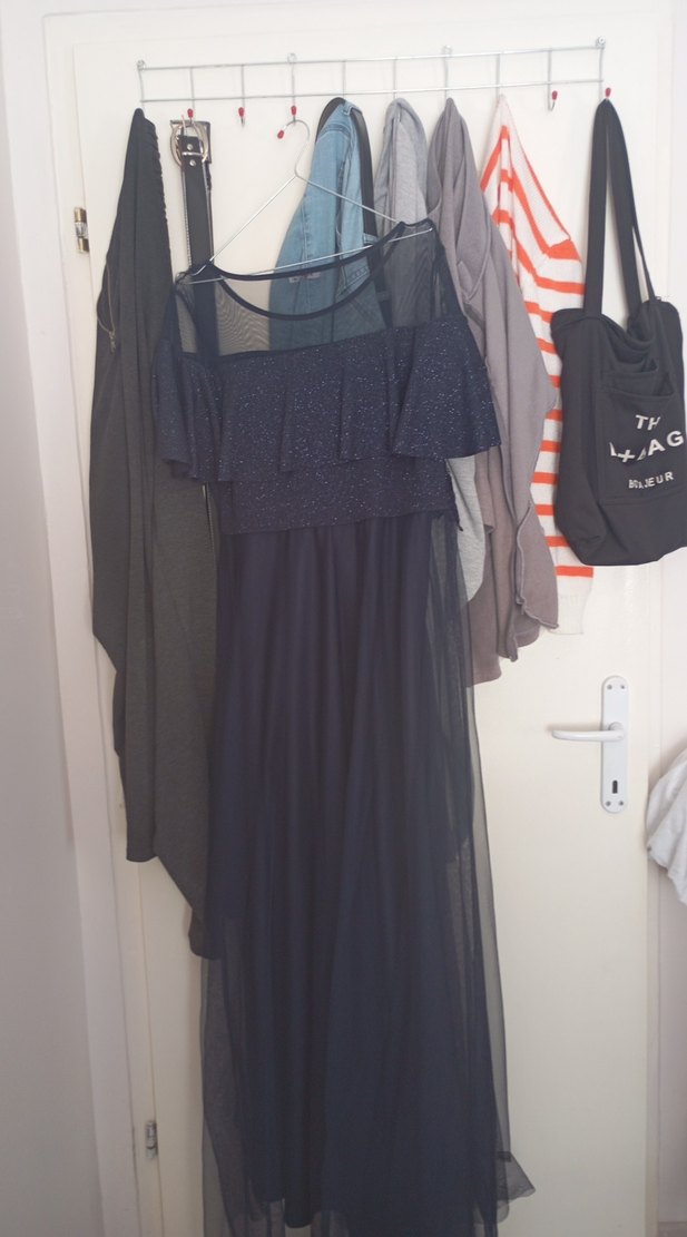 Lacivert uzun elbise, bol kesim ve drapeli detaylara sahip. Straplez yakası ve askılı kollu, yumuşak sentetik kumaştan günlük kullanıma uygun.
