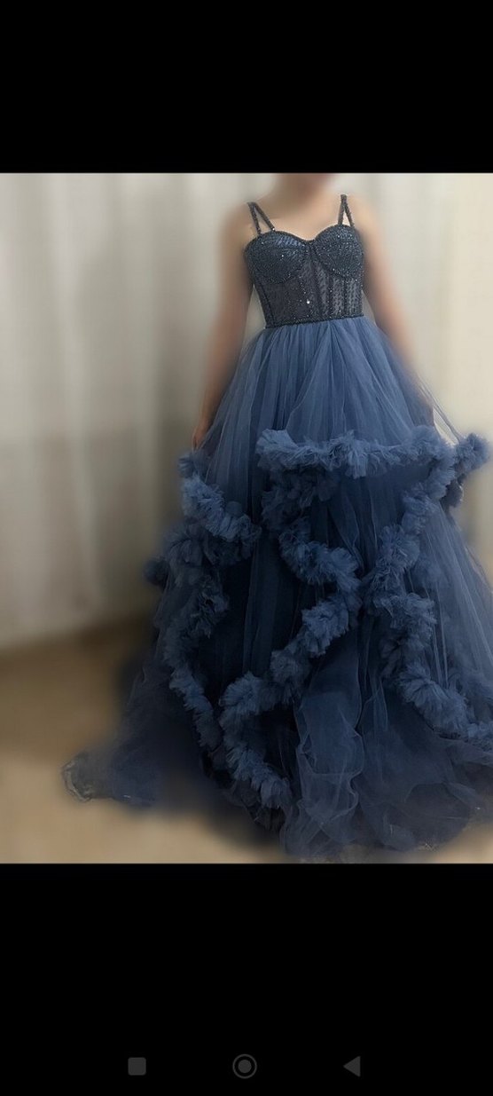 Uzun Lacivert Straplez Fırfırlı Nişan Elbisesi