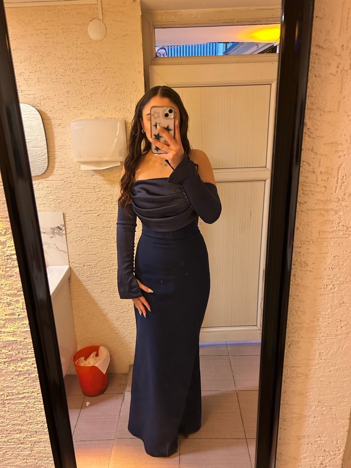 Lacivert uzun abiye elbise, straplez yaka ve drapeli detaylara sahip, uzun kollu ve cesur gotik tarzda romantik geceler için uygundur. M beden