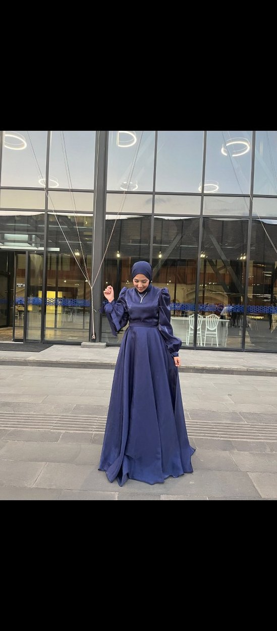 Uzun boylu lacivert renkte, yüksek yakalı ve uzun kollu, drapeli tasarıma sahip modest abiye. Düğünler için uygun, parlak ve desensiz, gothic sokak stili etkisiyle.