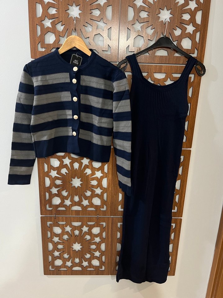 Uzun lacivert triko elbise, yuvarlak yaka ve düğmeli çizgili uzun kollu triko hırka ile tamamlanmıştır. standart beden S m beden uyumludur