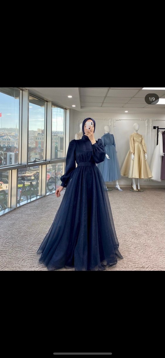Uzun lacivert tüllü abiye, yüksek yakalı, uzun kollu ve bol kesim olup, drape detaylarıyla sade şıklık sunar. Defosu yoktur 3 kere giyilmiştir hala yepyeni çok iyi duruyor şalı ile birlikte MELİHA TARHANA markasına aittir. Özenle kullanıldı söküğü vs yoktur. Rengi ilk fotoğrafta ki gibidir ne çok koyu ne çok açık kendi sitesinde fotoğraflarda gördüğünüz gibi 4500 indirilimli halidir normal fiyatı 7 bin küsür ben 4 küsüre almıştım