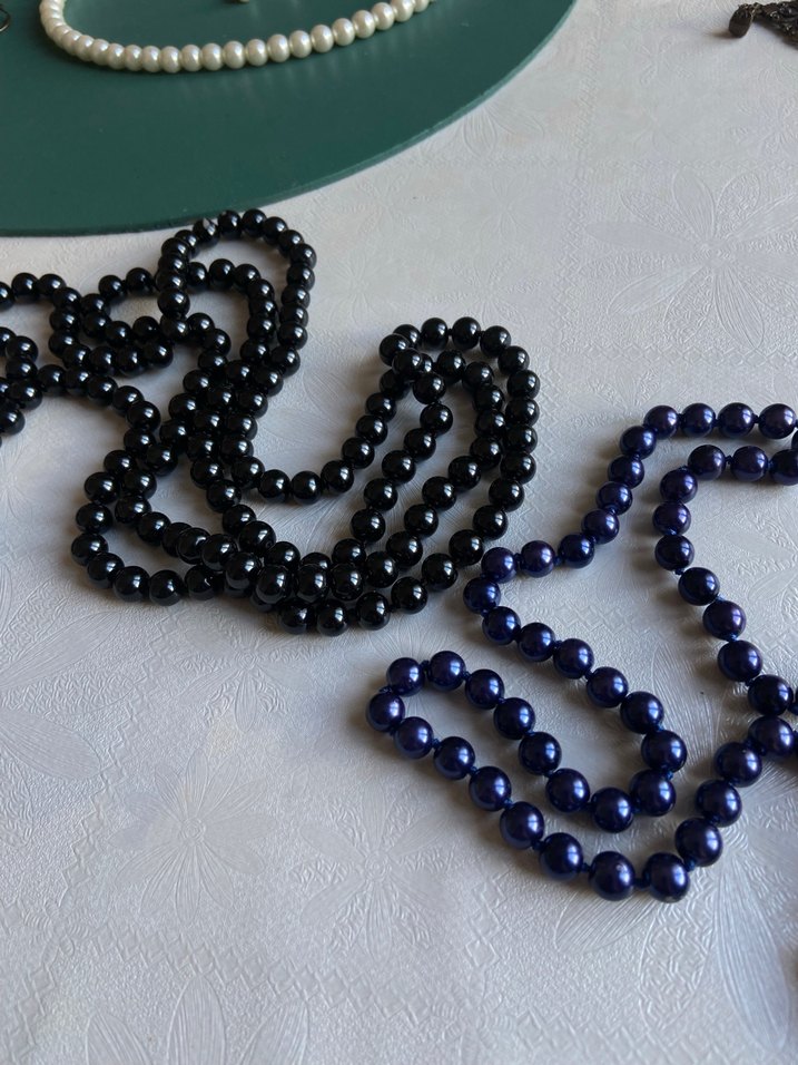 Uzun lacivert ve siyah boncuklardan oluşan, klasik gotik tarzda günlük kullanıma uygun kolye. Boncuklar parlak ve desensizdir.