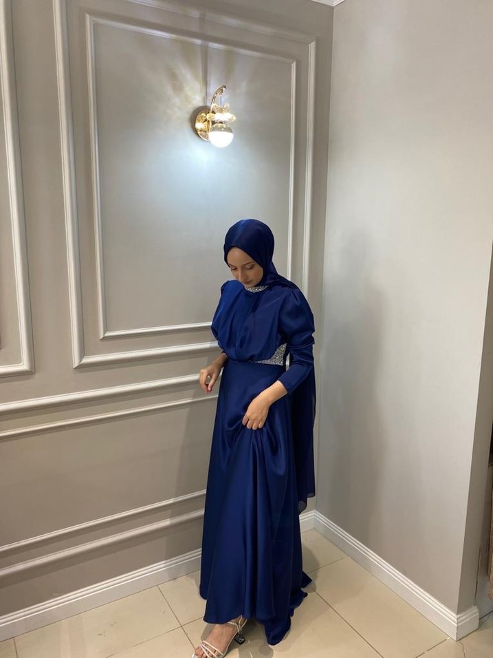 Uzun lacivert abiye elbise, yüksek yaka ve uzun kollu, drapeli tasarımıyla sade ve modern bir şıklık sunar. Düğünler için uygun, rahat kesim ve minimalist tarzda.ipek satendir 2 ve 3 fotoğrafta kameradan dolayı açık mavi gibi gözükmüş rengi saks mavisidir 1 fotoğrafta daha net gözüküyor sadece bir tane taşı düşmüş bel kısmından yakından çektiğim için gözüküyor Normal şartlarda belli olmuyor Bir kere düğünde giyildi abiyede 40 beden yazıyor ama ben 38 bedenim 40'a da olur