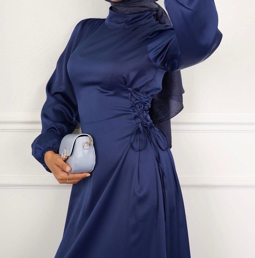 Parlak lacivert kumaştan, yüksek yakalı ve uzun boylu, drapeli yan detaylı ve ince askılı kollu, modern ve mütevazı kesim kadın abiye elbise. ✨