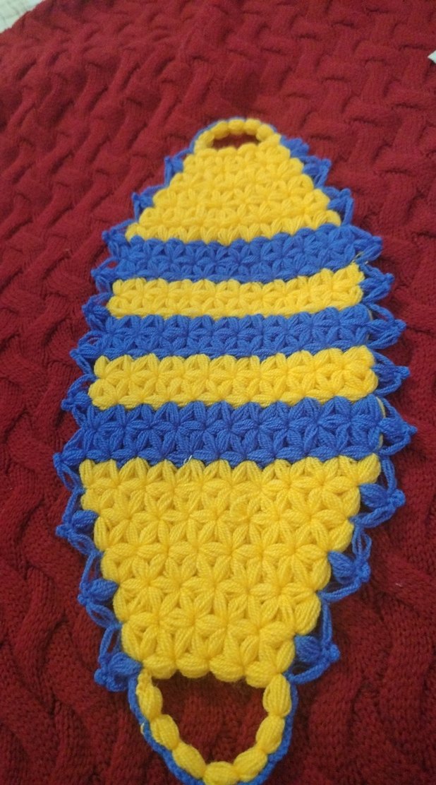 Mavi ve sarı renklerde, örgü dokulu renkli banyo süngeri, nazik cilt temizliği için uygundur.