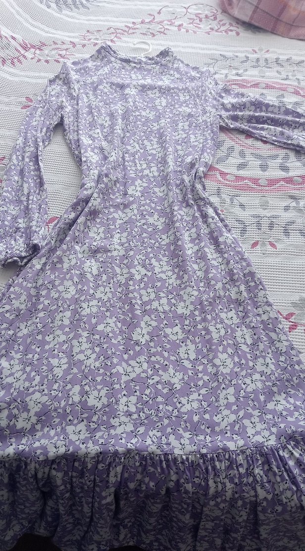 Uzun Lila Çiçekli Fırfırlı Bohem Elbise