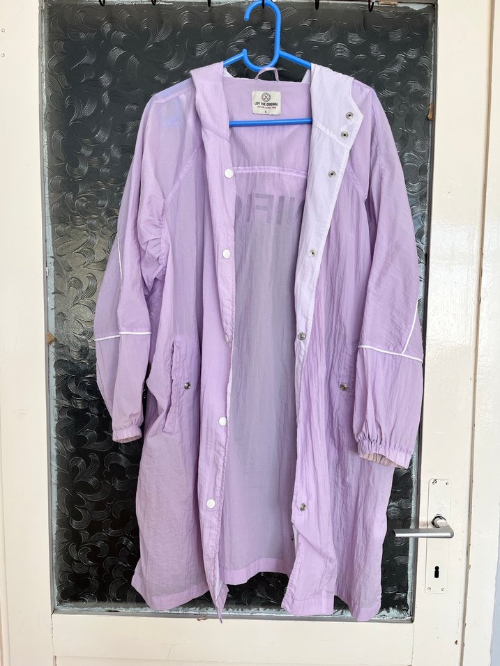 Lila renkte, uzun ve bol kesim kadın yağmurluğu. Düğmeli, kesik yakalı ve uzun kollu. Keten kumaştan, minimalist sokak stili için uygun. ️