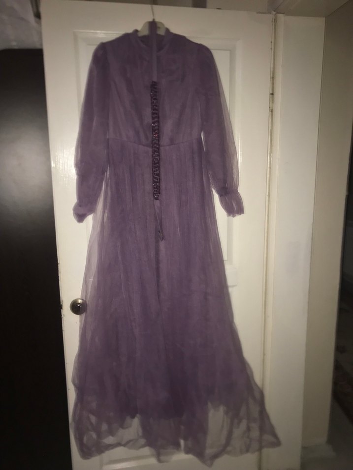 Bu uzun mor elbise, drapeli ve bol kesimdir. Uzun kollu ve yüksek yakalısıdır. Pastel tonlarda vintage goth tarzını yansıtır, düğünler için uygundur.