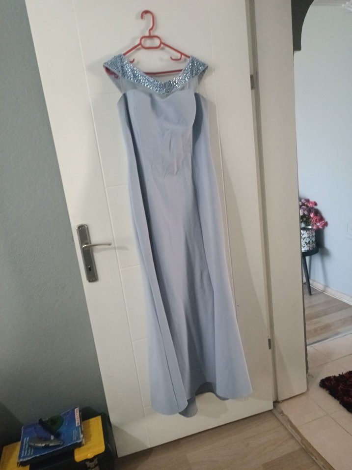 Uzun, mavi kesime sahip drapeli detaylarla klasik ve minimal bir şıklık sunar. Kolsuz tasarımıyla düğünler için uygundur. resimlerinde kusurlarının fotolarını çektim koydum bunun için ucuza satıyorum