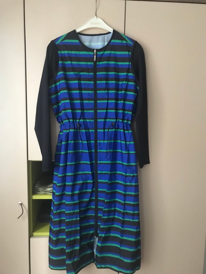 Uzun, koyu mavi bağcıklı haşema fermuarlı ön ve uzun kollu.