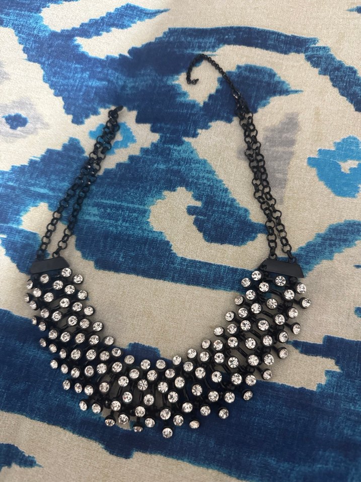 Uzun mavi boncuk detaylı, koyu bağlamalı desenli kolye. Rock punk ve grunge tarzını yansıtan, günlük kullanıma uygun bohem dokunuşlu bir aksesuar.