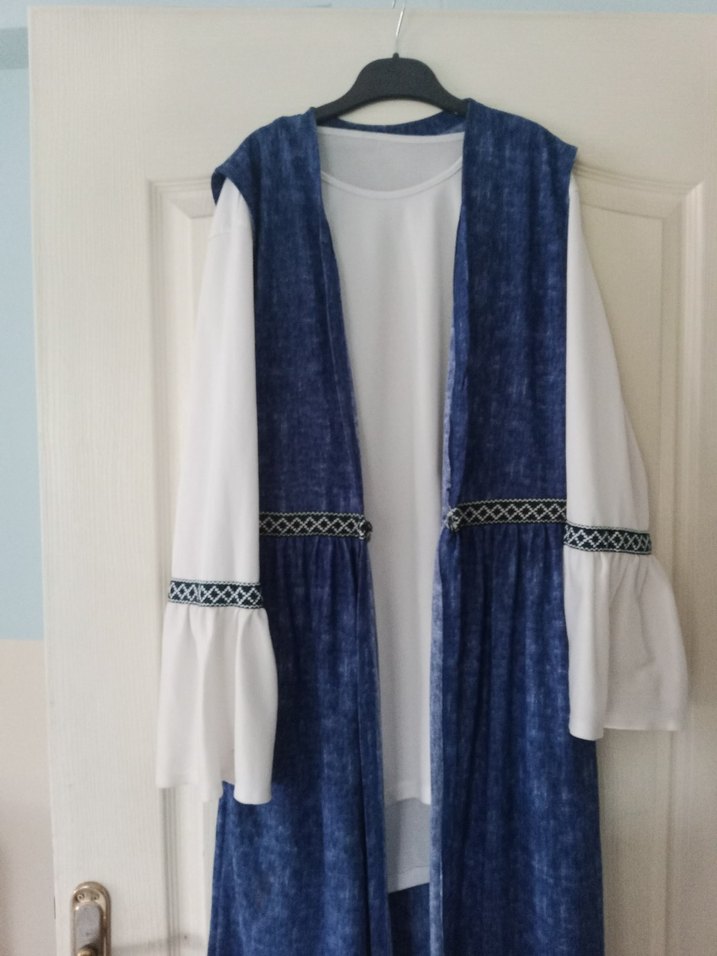 Bol kesim, uzun mavi batik desenli kolsuz yelek, beyaz ve volanlı kollu bluz ile tamamlanmıştır.