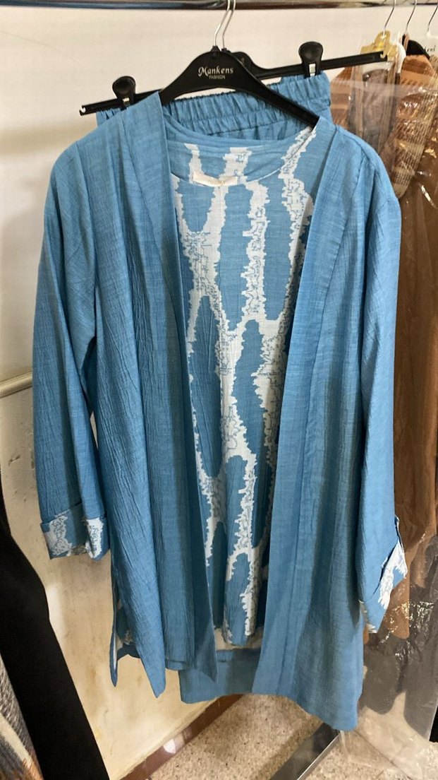Uzun Mavi Batik Desenli Kadın Keten Kimono takım mankens markası