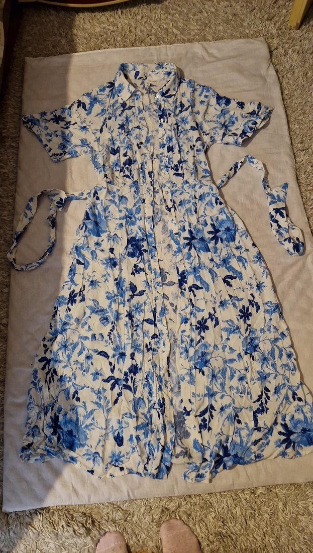 Bu uzun, bol kesim kadın elbise, açık mavi batik çiçek desenine ve kısa kollara sahip, bohem tarzını yansıtıyor. Belde ayarlanabilir bağlama bulunur.