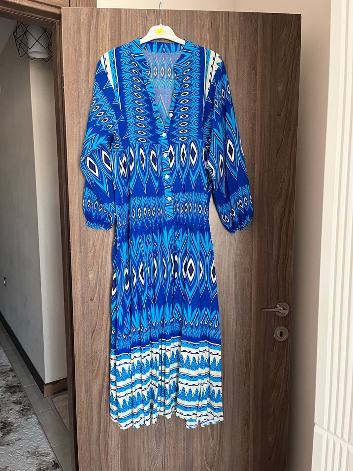 Uzun Mavi Bohem Desenli Elbise
