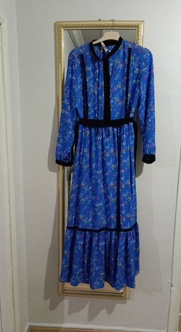 Uzun, bol kesim mavi elbise, fırfır detaylı ve yüksek yakalıdır. Uzun kollu ve günlük kullanıma uygundur.