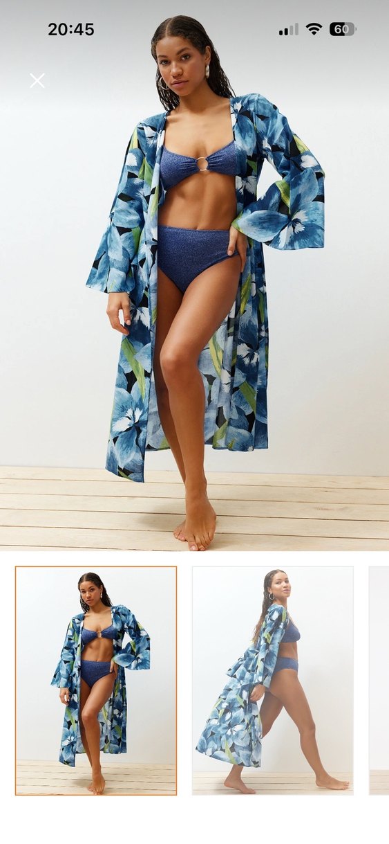 Uzun, bol kesim mavi kimono, hafif batik desenli ve dökümlü tasarıma sahiptir. Yumuşak sentetik kumaştan yapılmış, cesur plaj görünümü için idealdir.