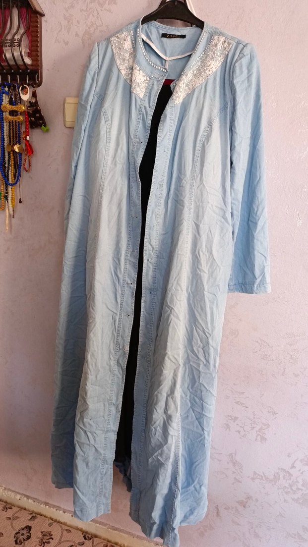 Uzun, bol kesim kadın sabahlık, uzun kollu ve pastel mavi renktedir. Rahat, bohem tarzda dantel yakalıdır. Desensiz ve konforludur.