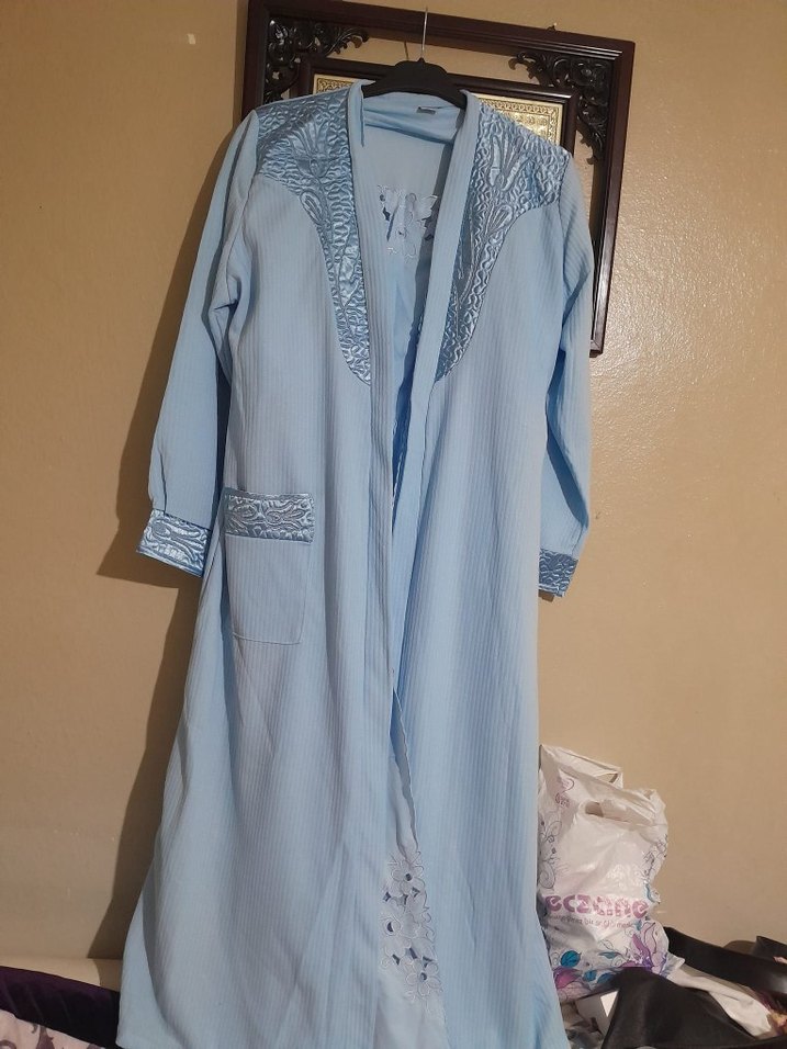 Uzun, bol kesim kadın sabahlık, uzun kollu ve pastel mavi renkte. Bohem detaylar ve cep ile sade tasarım sunar.
