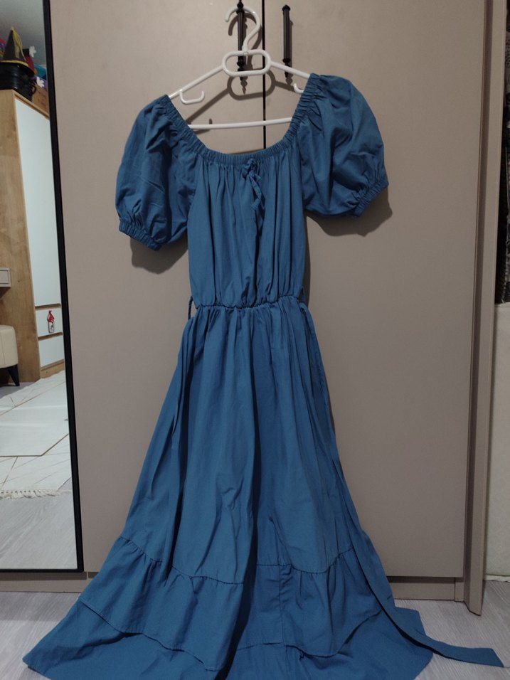Bu uzun mavi bohem elbise, bol kesim, balon kol ve fırfır detaylarına sahip, nefes alabilen keten kumaştan üretilmiştir. Kayık yaka ve desensizdir, günlük kullanıma uygundur. indirim payı vardır